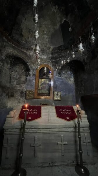 وقد وضع بها ناووس كبير يحوي رفات القدّيس إذ بلغ طول الناووس 23،2م وعرضه 35،1م أما ارتفاعه 6,1م؛ وله غطاء هرمي الشكل، يزيّن جوانبه مع الغطاء 11 صليباً نافراً.