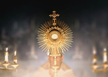 مسبحة القربان الأقدس تتلى بإستخدام المسبحة الوردية الإعتيادية. نبدأ بتلاوة الأبانا والسلام الملائكي والمجد مرة واحدة من أجل نوايا...