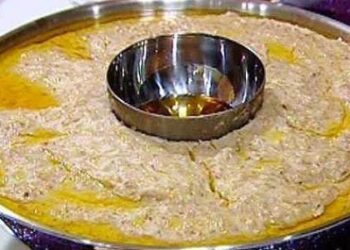 كباب بالباذنجان يجب أن يكون الفحم قليل حتى لا تشوى الحلقات دون نضجها من الداخل. المقادير: -...